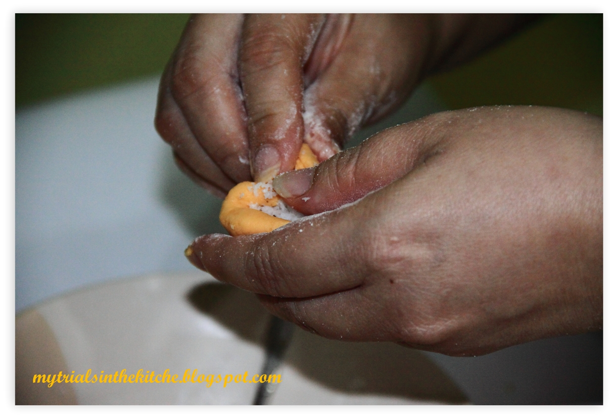 5.   Flat the ball shape dough on your palm and place the filling using a teaspoon on it,